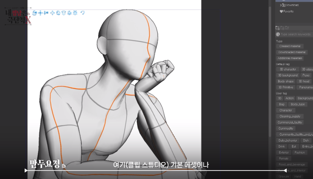 저는 작업을 시작할 때 3D 모델링을 가장 먼저 세팅해 놓는 편이에요. 인물, 체형, 배경 등을 먼저 3D로 스케치하듯이 구도를 잡고 드로잉을 시작하고 있습니다. 이렇게 먼저 크게 구도를 잡아 놓는 것만으로도 작업 시간이 단축된답니다. 제가 각 부분을 하나씩 만들지 않아도 프로그램에 탑재된 에셋이나 다른 분이 만들어 놓은 디자인을 활용해 저에게 적합한 디자인으로 조금만 수정하면 되기 때문이에요. 그래서 가장 먼저 세팅된 3D 위에다가 스케치를 하고 있습니다.
