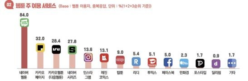 2023 만화·웹툰 이용자 실태조사 보고서에 따르면 인스타그램은 웹툰을 보는 창구로서 네이버·카카오의 바로 뒤에 위치해 있는데요. 인스타그램에서 만화를 소비하는 독자들이 증가했다는 것을 알 수 있는 지표가 아닐까 싶습니다.