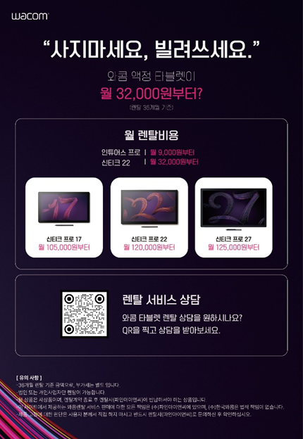 이미 웹툰, 디자인 등의 창작 스튜디오를 비롯한 학원 및 교육센터에서는 와콤 타블렛 렌탈 서비스를 활발하게 이용하고 있는데요. 이번 기회를 통해 사용해 보고 싶었던 와콤 타블렛을 가격 부담 없이 사용해보고, 한층 업그레이드된 창작 업무 환경을 구축해 보시는 건 어떨까요?