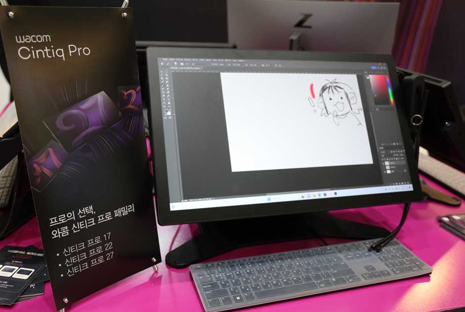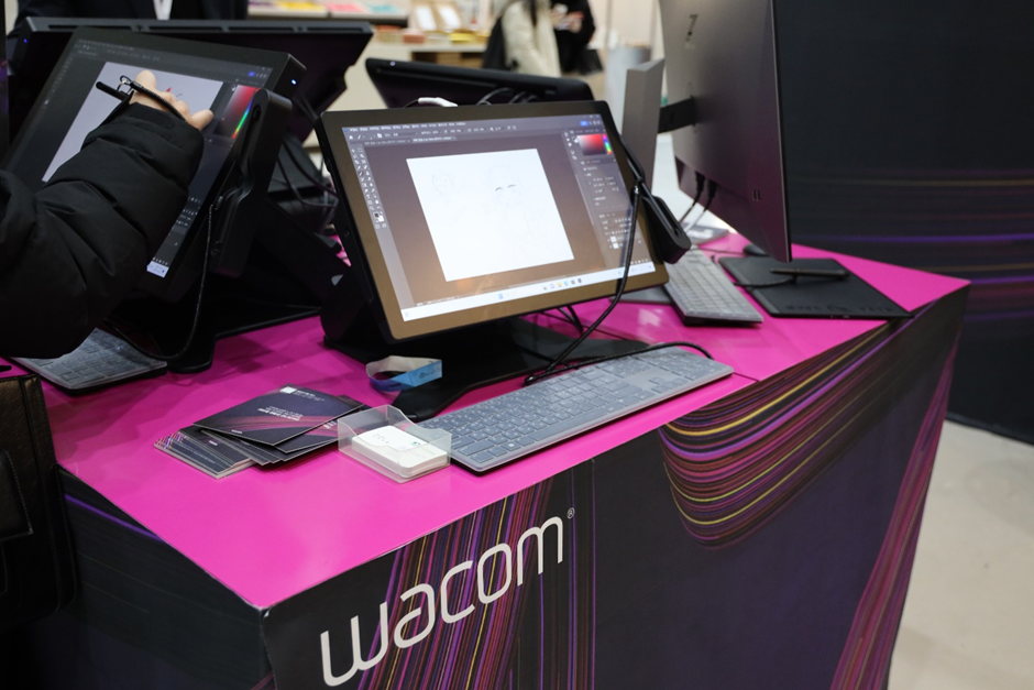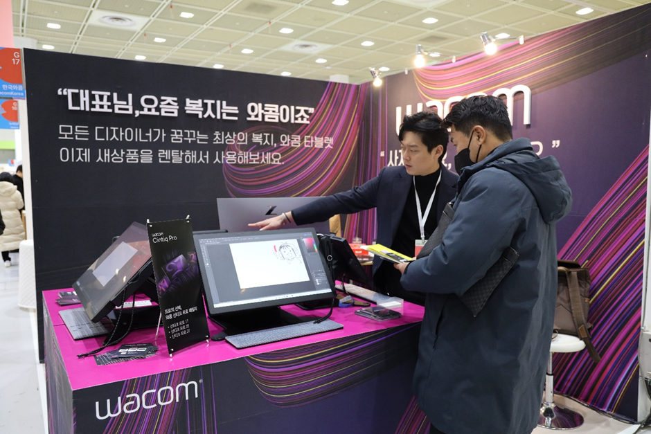 특히 이번 행사에서는 와콤의 주요 타블렛 전시와 더불어 기업 고객을 대상으로 와콤 타블렛 렌탈 서비스를 선보였는데요. 해당 서비스에 많은 분들이 관심을 가져 주셨어요. 와콤 타블렛 렌탈 서비스는 와콤의 펜 타블렛과 액정 타블렛 새 상품을 일정 기간 약정해 매월 렌탈료를 지불하며 타블렛을 대여, 사용하는 방식입니다. 사업자라면 개인과 법인 모두 이용 가능하며, 와콤의 대표 펜 타블렛 인튜어스 프로는 물론 액정 타블렛 신티크, 신티크 프로 등 프로페셔널을 위한 타블렛 모두 서비스로 사용해 볼 수 있습니다.