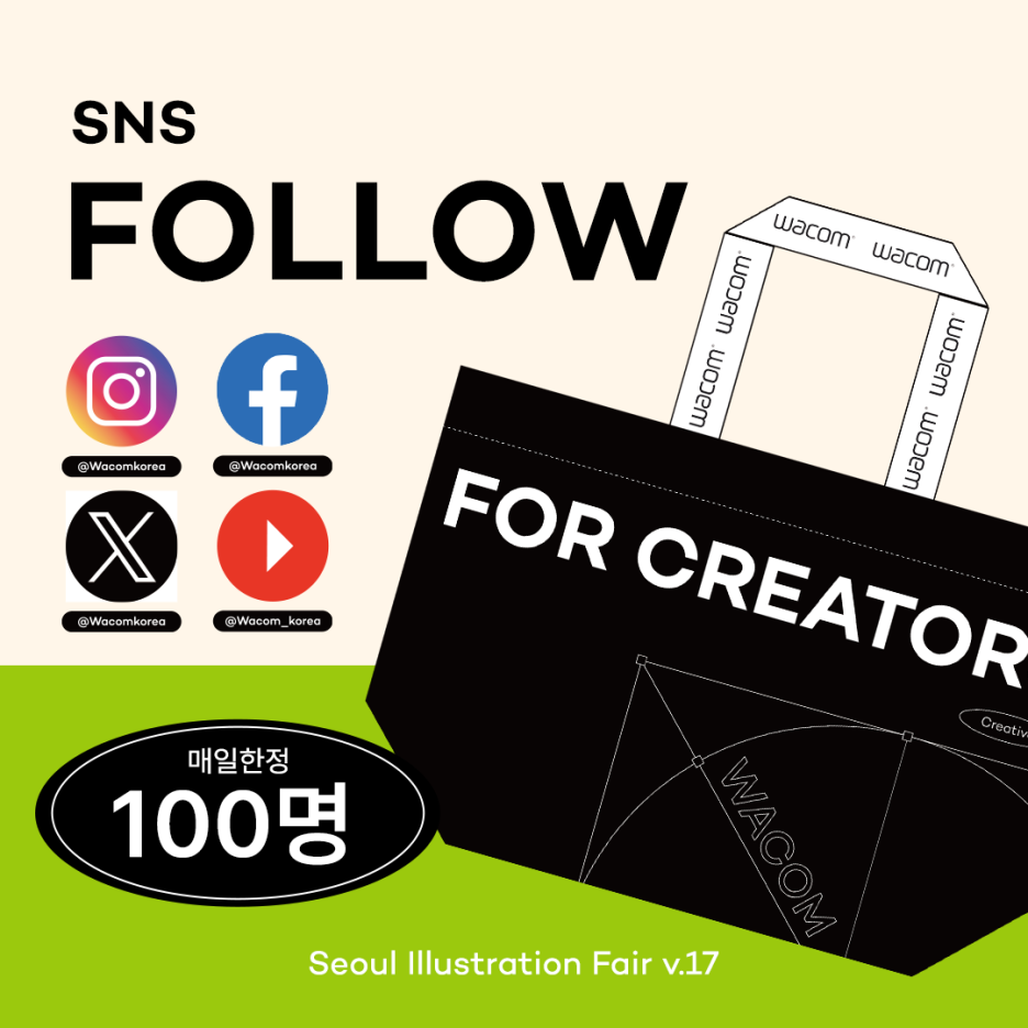 이외에도 와콤 공식 소셜 채널 팔로잉 인증 시 매일 100명 한정으로 증정(1인 1개)되는 와콤 리유저블백 증정 이벤트와
