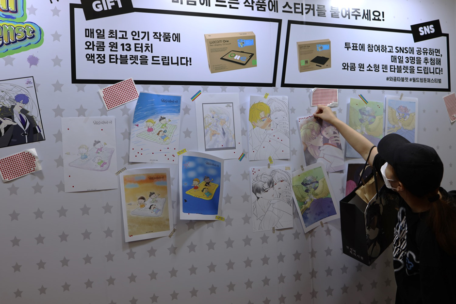 그림을 직접 그리지 않는 분들을 위한 이벤트도 당연히 준비됐습니다. 와콤 부스에 전시된 그림에 투표한 후 투표하는 모습이나 투표한 작품 등의 이미지를 개인 SNS에 공유하는 참관객들 또한 추첨을 통해 매일 세 분께 와콤 원 소형 펜 타블렛을 증정할 예정입니다. 고사양 액정 타블렛을 사용해 나만의 작품을 완성하고, 와콤 타블렛을 선물 받을 수 있는 특별한 기회를 놓치지 마세요!