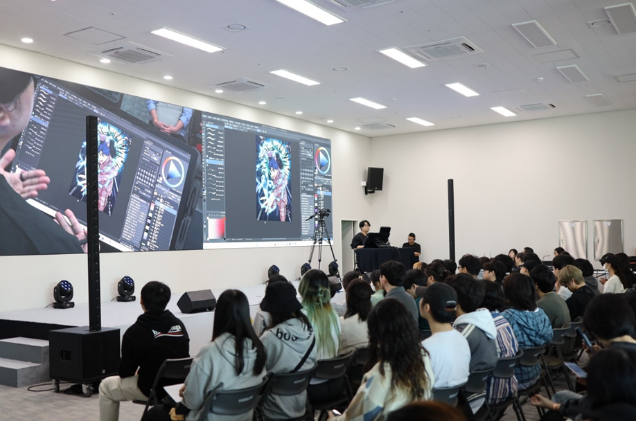 첫 번째 세션은 감독9 작가님의 작품 시연 및 웹툰 드로잉 스킬 업 특강으로 시작됐습니다. 작가님께서는 와콤 타블렛을 활용해 ‘강철을 먹는 플레이어’ 속 액션 캐릭터 스케치 방법부터 작가님만의 드로잉 노하우를 알려주셨는데요. 50분이라는 한정된 시간 내 노하우 방출부터 스피드 페인팅으로 캐릭터 완성까지 해내시는 작가님의 모습에 많은 학생들이 놀라움을 표했답니다.