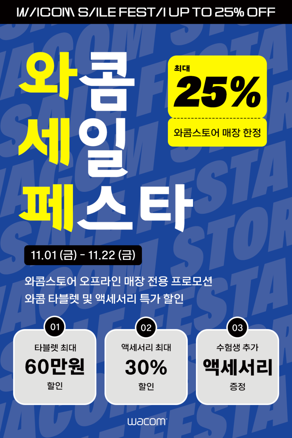 제품에 따라 최대 60만원의 할인 혜택을 받을 수 있고, 액세서리는 최대 30% 할인 혜택을 제공한다. 특히 올해 수능을 앞두고 있는 수험생 대상으로는 행사 기간 내 타블렛 및 액세서리 구매 시 추가 액세서리를 증정할 예정이니 수능날까지 파이팅 하시고 와콤스토어에서 만나요:)