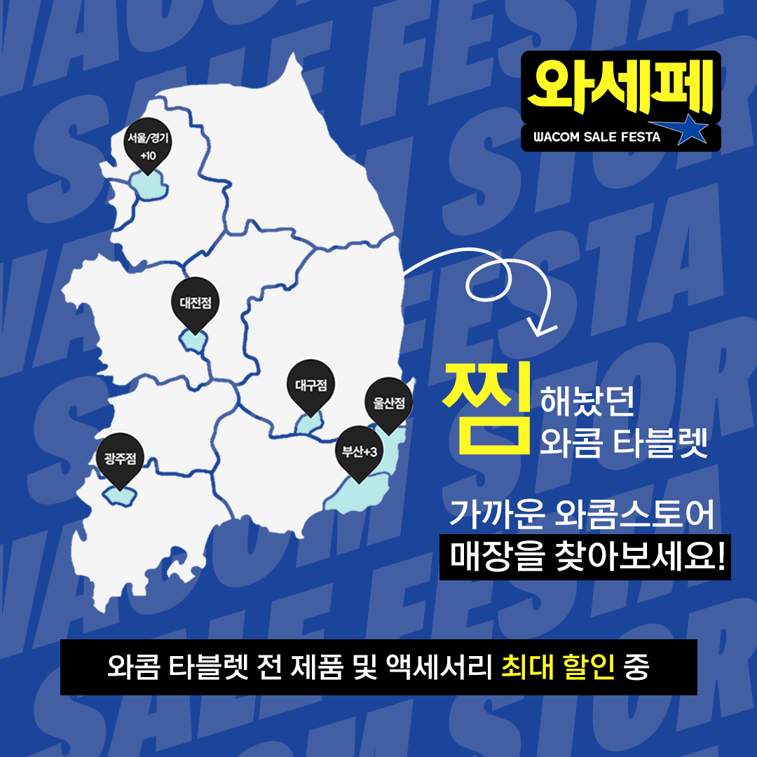 국내 쇼핑 축제 기간을 맞아 와콤은 오프라인 매장인 전국 13곳의 와콤스토어 매장에서 와콤 타블렛 전 품목 및 액세서리 구매 시 특별 할인 혜택을 제공하는 ‘와콤 세일 페스타’가 열립니다.