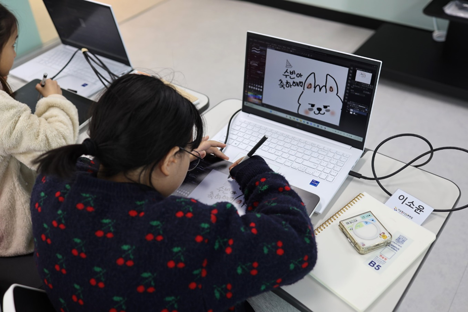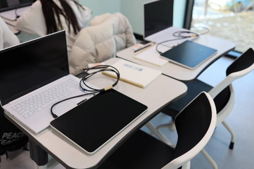 특히 디지털 드로잉 수업에는 웹툰 작가, 일러스트레이터 등 창작 전문가들이 사용하는 와콤의 타블렛을 32대 도입해 전문 창작 환경을 구축했다. 13인치의 디스플레이에 손 터치 기능이 탑재된 ‘와콤 원 13 터치’ 액정 타블렛은 디지털 드로잉부터 이미지 편집, 노트 필기 등 입문자부터 전문가까지 편리하게 사용할 수 있어 초등학생 대상 디지털 창작 프로그램에도 원활하게 사용할 수 있다. 디지털 드로잉 강좌 수강 학생들은 ‘와콤 원 13 터치’ 액정 타블렛을 활용해 작품 기획부터 완성까지 주도적으로 창작물을 완성하고 있다.