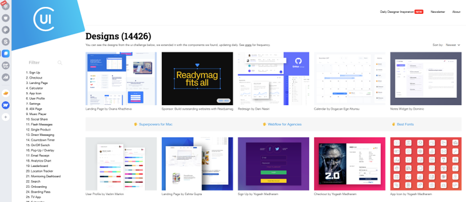이외에도 사이트 내 작업물을 업로드한 모든 디자이너들을 리스트업해 사용자의 취향에 적합한 디자인을 참고할 수 있을 뿐만 아니라 매일 오전 사이트 내 업로드 되는 새로운 디자인 등의 내용을 뉴스레터로 발송해 보다 편리하게 디자인 레퍼런스를 확인할 수 있답니다. 일반 디자인은 물론 UI 디자인을 고민하고 있다면 Collect UI 페이지를 살펴보는 것도 추천해 드립니다.
