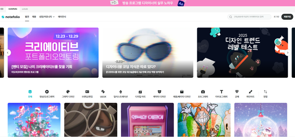 노트폴리오는 국내 최대 포트폴리오 플랫폼입니다. 전 세계 크리에이터를 대상으로 했던 앞선 두 웹사이트와 달리 노트폴리오에서는 국내 디자인 트렌드를 용이하게 확인할 수 있습니다. 현재 13만 이상의 회원이 노트폴리오를 이용하고 있으며 국내 디자인 포트폴리오 수에서 1위를 기록하고 있는 만큼 다양한 레퍼런스 확인이 가능합니다.