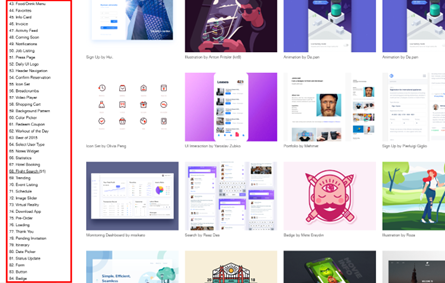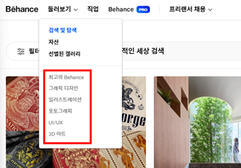 자신의 포트폴리오를 업로드하거나 인사이트를 얻고자 검색을 할 때 디자인 분야별로 나뉘어진 페이지에 들어가게 되면 한 단계 더 세분화된 메뉴를 확인할 수 있습니다. 사용자는 자신의 니즈에 맞춰 세분화된 목록에서 좀 더 다양한 작품들을 확인할 수 있습니다. 전 세계 디자이너들의 관점이 적용된 많은 작품을 정리된 페이지에서 한 번에 볼 수 있어 레퍼런스 참고에는 안성맞춤인 것 같네요.