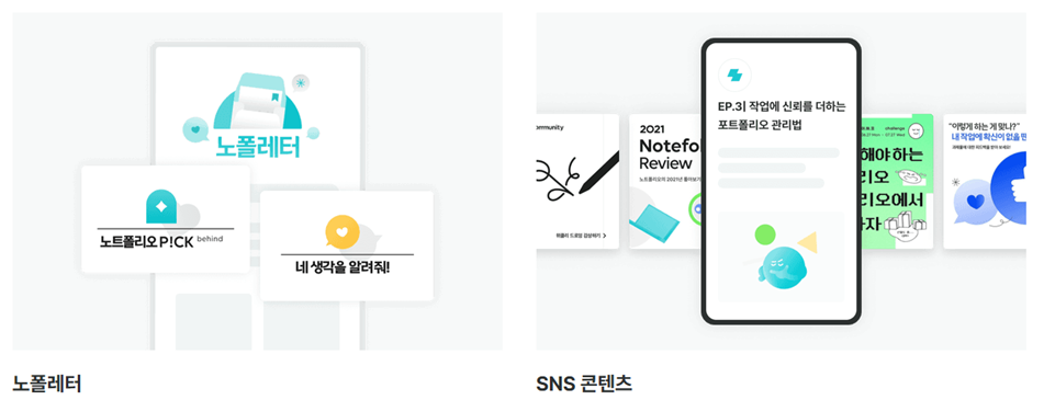이와 함께 노트폴리오는 포트폴리오 플랫폼의 역할을 넘어 크리에이터들의 커뮤니티를 운영, 온/오프라인 워크샵, 분야별 오픈 채팅방, 스터디 등 다양한 성장 기회를 제공하고 있습니다. 이와 함께 인사이트를 발견할 수 있는 ‘다양한 아티클 업로드’, 노트폴리오가 직접 발행하는 창작 업계 소식, 창작자 인터뷰, 비하인드 스토리, 채용소식 등의 내용이 담긴 ‘노폴레터 발행’, 노트폴리오에서 진행 예정인 성장 프로그램, 팀 이야기, 활용 가이드 등 다양한 콘텐츠를 비정기적으로 발행하고 있습니다. 이렇듯 크리에이터의 성장에 진심인 노트폴리오를 활용한다면 디자인 감각 향상은 물론 디자인 분야에 갖고 있는 고민 및 궁금증 등까지도 해소할 수 있을 것 같네요.