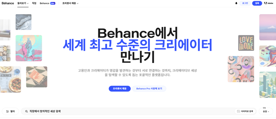 비핸스(Behance)는 사진, 동영상, 이미지, 그래픽 디자인 등의 미디어 관련 작업이 가능한 소프트웨어 어도비(Adobe)를 이용해 제작한 작품을 전시하고 검색할 수 있는 세계 최대 규모의 크리에이티브 네트워크 페이지입니다. 어도비에서 운영하고 있어 전 세계 5,000만 명 이상의 창작자들의 작품이 전시되며 이에 최신 디자인 트렌드를 파악할 수 있을 뿐만 아니라 보다 전문적이고 깊은 인사이트를 얻을 수 있죠.