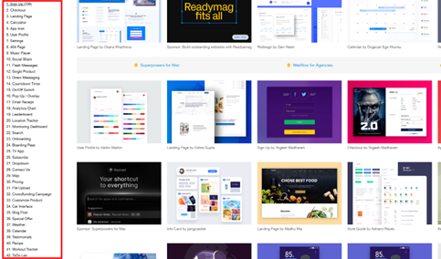 페이지 좌측에는 특정 기능별로 나뉘어진 여러 카테고리를 직관적으로 확인할 수 있는데요. UI 디자인을 총 167가지로 세분화해 사용자의 니즈에 적합한 디자인을 빠르게 찾고 참고할 수 있어 효율적인 디자인 작업이 가능합니다.