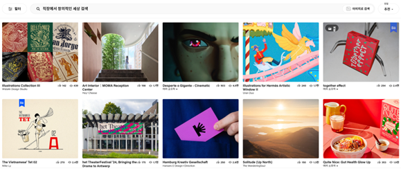 사용자가 검색하고 싶은 분야를 단어 뿐만 아니라 이미지로도 검색할 수 있다는 점이 유용하며, 필터 검색을 통해 보다 구체적으로 원하는 결과를 빠르게 도출해낼 수 있습니다. 또 그래픽 디자인, 일러스트레이션, 포토그래피, UI/UX, 3D 아트 등 디자인 분야별로 페이지가 분류돼 있어 사용자의 편리함을 극대화했죠.