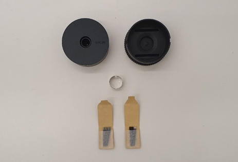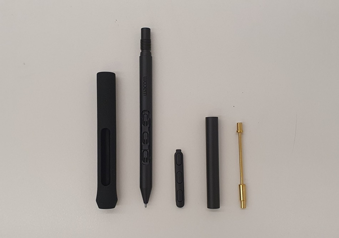 다음으로 소개해드릴 구성품은 USB C to A 케이블과 펜 그립 및 교체용 사이드 버튼 플레이트(3입)가 삽입된 미니 박스입니다. 미니 박스 안에는 와콤 프로 펜 3에 이미 장착된 플레어형 그립 외에 추가적으로 일자형 그립이 포함돼 사용자의 손 모양, 그립감 등을 고려해 변경할 수 있습니다. 또 사이드 버튼 플레이트(3개)도 포함돼 작업자의 스타일에 그립을 쓸 때, 그립을 쓰지 않을 때, 사이드 버튼을 쓰는 사용자를 위한 버튼 플레이트, 사이드 버튼을 쓰지 않는 사용자를 위한 버튼 플레이트가 있으니 누구나 나만의 펜 스타일을 세팅해서 사용할 수 있습니다.
