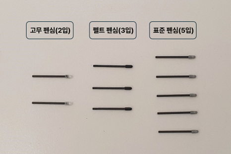 펜 스탠드의 뚜껑을 열면 펜심을 제거할 수 있는 펜심 제거기와 함께 다양한 펜심이 들어있습니다. 창작자의 취향에 맞게 커스터마이징 할 수 있도록 표준 펜심(5입)과 펠트 펜심(3입), 그리고 새롭게 선보이는 고무 펜심(2입)이 들어있죠. 다양한 타입의 펜심을 써 보고 취향에 맞는 걸로 골라서 사용할 수 있어요.