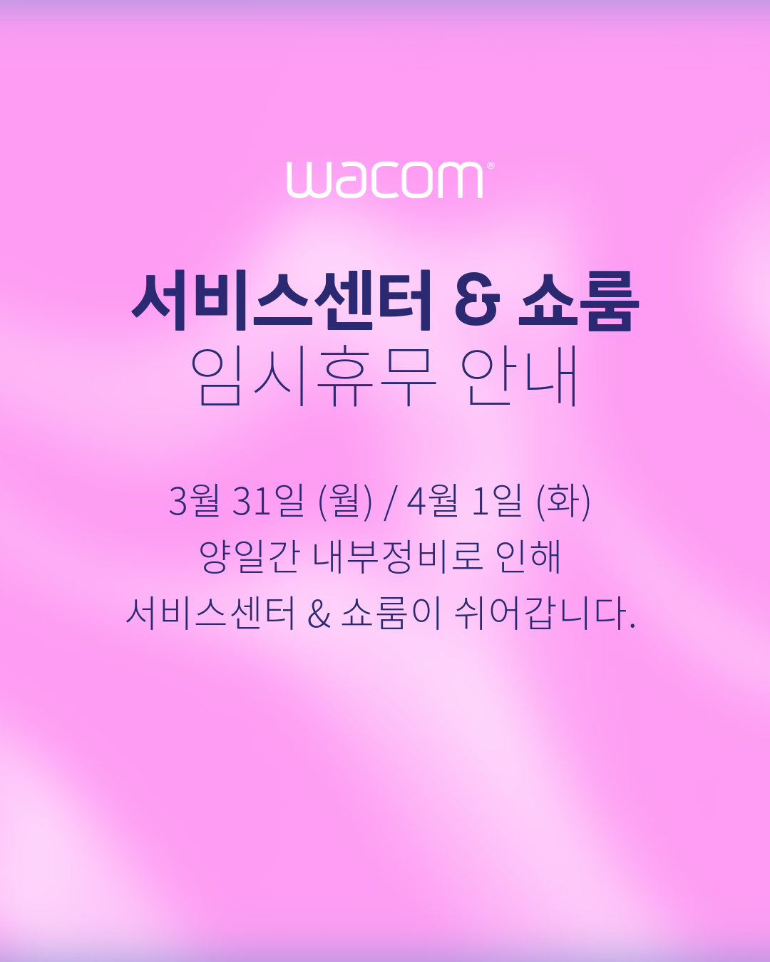 Brand/After Service 와콤서비스센터&쇼룸 임시휴무 안내 2025. 3. 28. 14:01 📢와콤서비스센터&쇼룸 임시휴무 안내 3월 31일(월) & 4월 1일(화) 내부정비로 인해 서비스센터와 쇼룸이 쉬어갑니다. 방문예정이셨던 고객님들께 불편함을 드리게 되어 죄송한 말씀 드리며 수요일부터 다시 맞이하겠습니다. 공유하기 게시글 관리 Wacom Blog 저작자표시 비영리 변경금지 (새창열림) 'Brand/After Service' Related Articles 와콤코리아 서비스센터 & 쇼룸 방문하는 방법 방문 A/S 접수가 가능한 전국 와콤스토어 안내