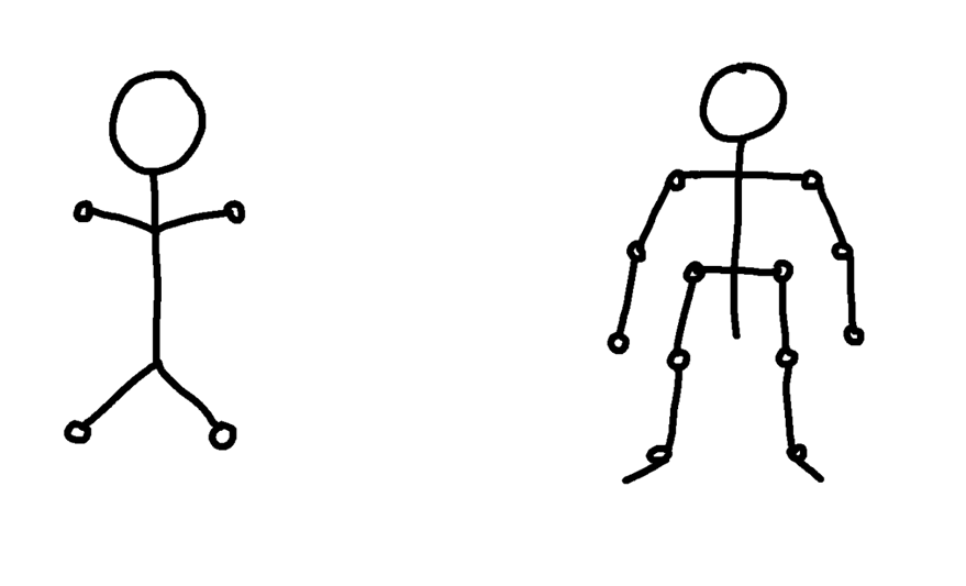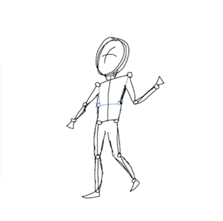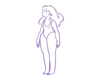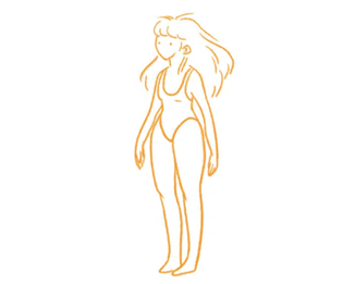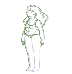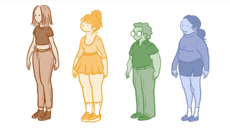 이와 반대로 살집이 있는 모습을 표현하고 싶다면, 턱을 더 동그랗게, 어깨를 더 넓게, 배와 팔다리를 더 두껍게, 그리고 몸과 팔다리 사이에 공간 없이 등의 드로잉을 통해 표현할 수 있습니다.