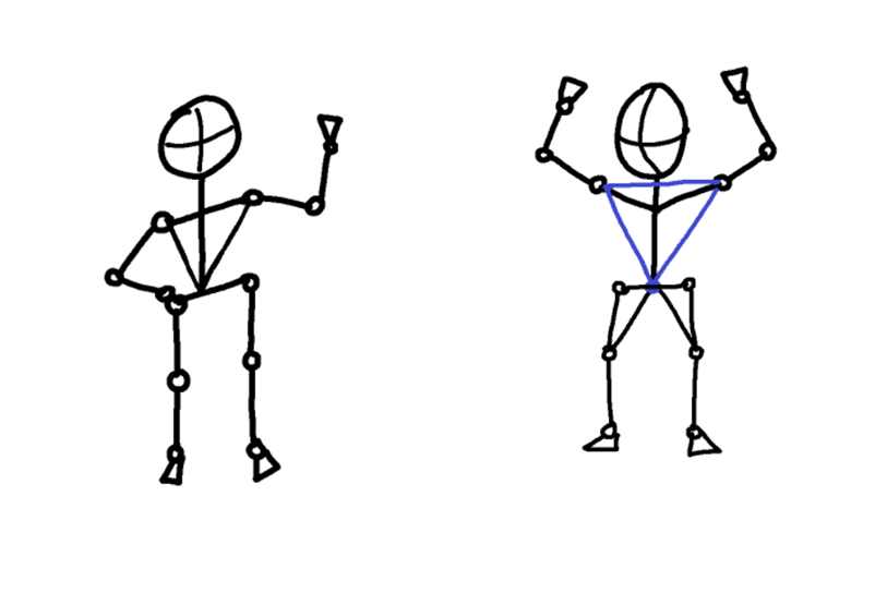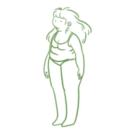 이와 반대로 살집이 있는 모습을 표현하고 싶다면, 턱을 더 동그랗게, 어깨를 더 넓게, 배와 팔다리를 더 두껍게, 그리고 몸과 팔다리 사이에 공간 없이 등의 드로잉을 통해 표현할 수 있습니다.