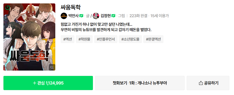최근 제가 가장 감명 깊게 본 작품은 박태준 작가님과 김정현 작가님의 『싸움독학(Viral Hit)』입니다. 몰입감이 뛰어난 서사와 함께 격투 장면 묘사 또한 굉장히 정밀하고 아름다워요. 개인적으로 저도 무술을 수련하는 사람으로서 매우 인상 깊게 봤습니다.