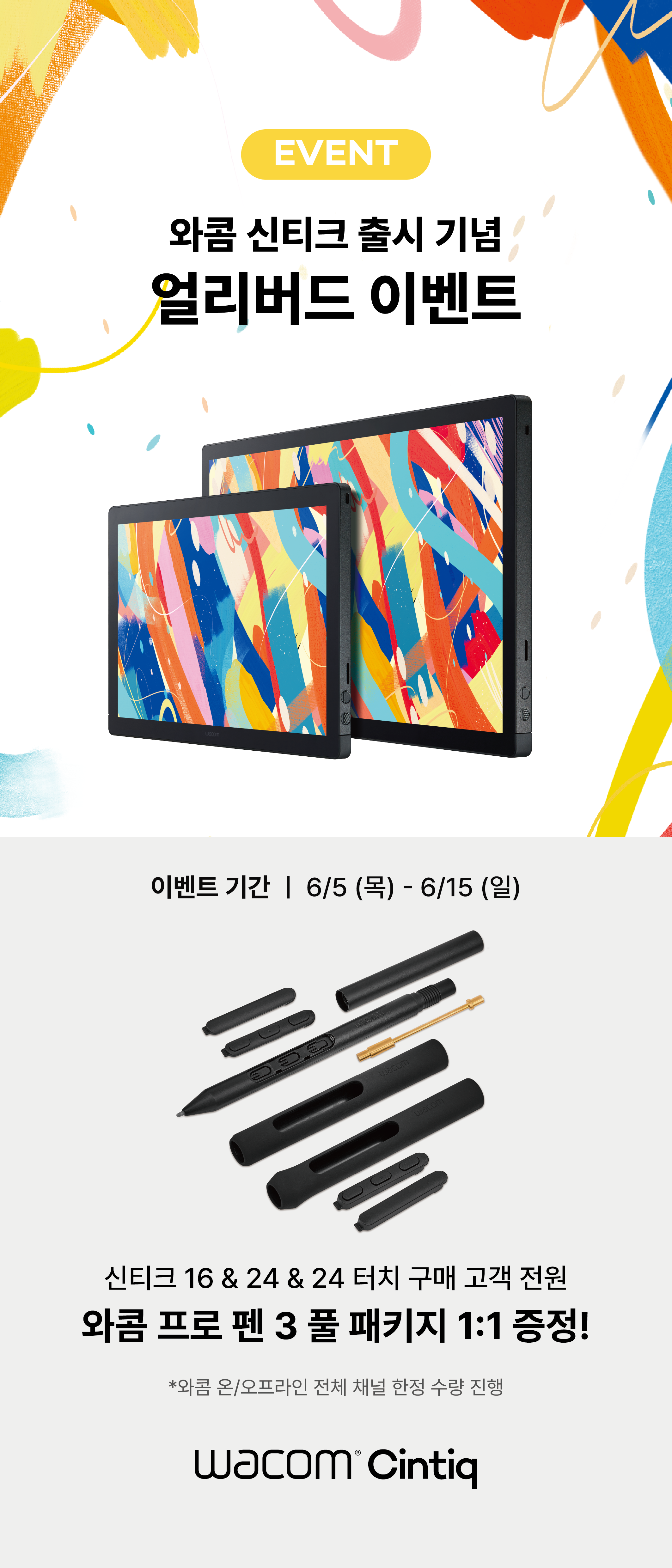 와콤은 이번 신티크 2025 신제품 라인업 출시를 기념해 오늘부터 오는 15일(일)까지 제품을 구매하는 고객을 대상으로 얼리버드 프로모션을 진행합니다. 해당 기간 동안 신제품을 구매하는 모든 고객분들께 풀 패키지 프로 펜 3를 제공할 예정이니 많은 관심 부탁드리겠습니다.