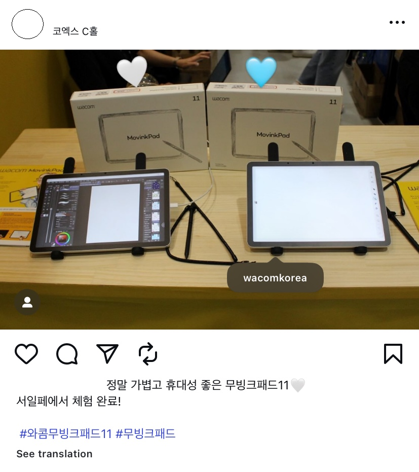 와콤 무빙크패드 11은 오늘부터 시작되는 서울일러스트레이션페어을 비롯해 원더페스티벌코리아, K-일러스트레이션페어 마곡 행사장과 함께 와콤스토어 홍대입구점, 강남점, 분당점, 부산광복점, 용산 전자랜드 1층 신규 와콤존까지 전국에서 만나볼 수 있으니 가까운 오프라인 행사장에서 신제품을 직접 체험하고, 와콤 무빙크패드를 만난 순간을 사진으로 남겨보세요.