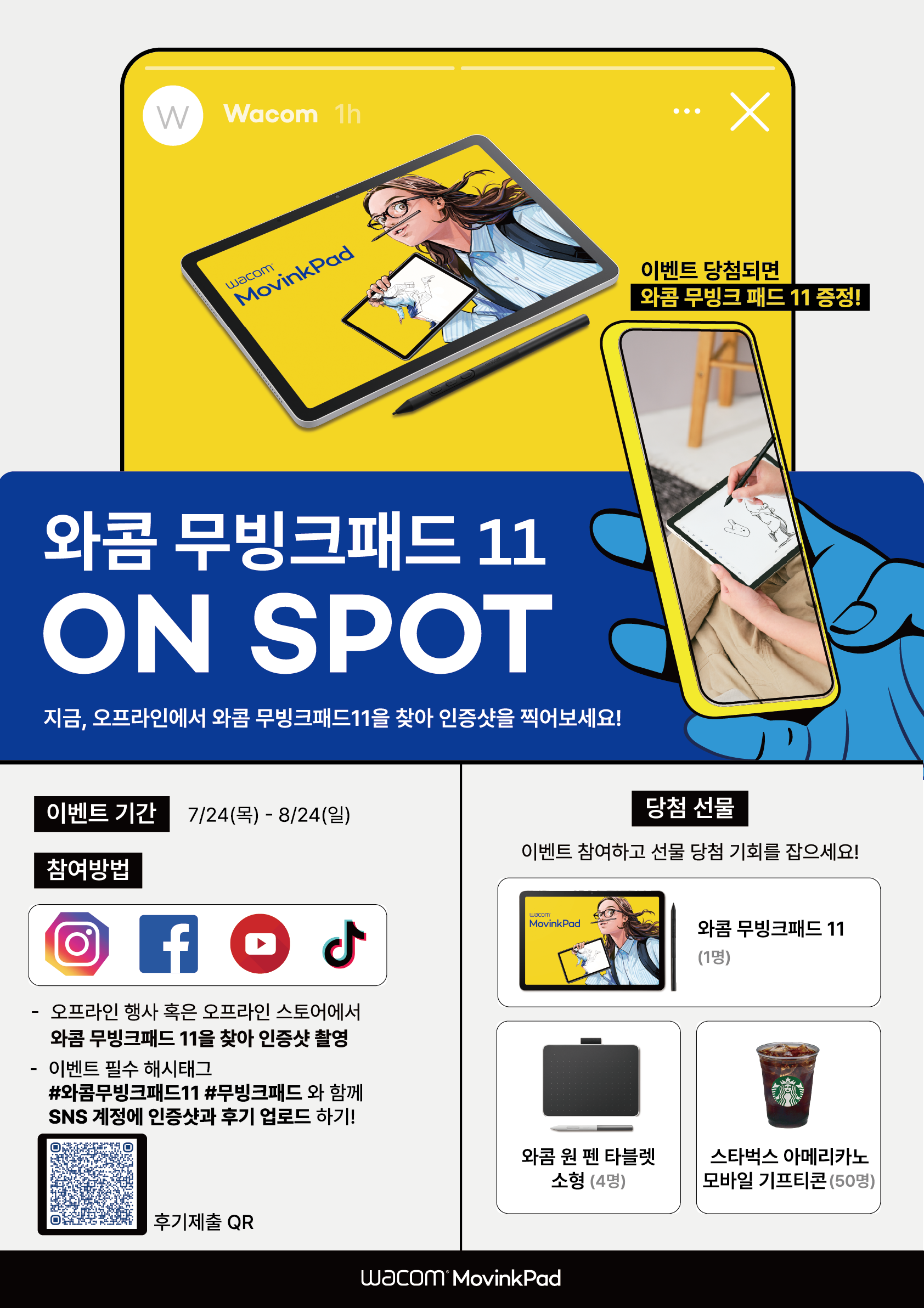 오는 9월 국내 판매를 앞두고 와콤은 신제품 무빙크패드 11 출시를 기념해 특별한 현장 이벤트를 준비했는데요. 이번 ‘와콤 무빙크패드11 ON SPOT’ 이벤트는 와콤 부스를 운영하는 오프라인 행사와 전국 5곳의 와콤 스토어에서 무빙크패드11을 직접 체험하고, SNS 인증샷과 후기를 남기면 추첨을 통해 무빙크패드 11 제품을 증정합니다. 오늘부터 8월 24일(일)까지 한 달 동안 펼쳐지는 이벤트 기간 동안 최신 휴대용 태블릿의 강력한 성능을 가장 먼저 경험하고, 다양한 혜택도 놓치지 마세요.