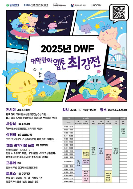 전국 대학 만화·웹툰 전공 학생들이 참가하는 창작 경연형 전시회입니다. 신진 작가들의 창의적인 작품을 감상하고, 웹툰 산업의 미래를 엿볼 수 있는 자리입니다. 이번 행사는 대전 웹툰 과학기술 포럼과 연계해 개최되며, 와콤 부스에서는 웹툰 작가를 위한 드로잉 장비를 만나볼 수 있습니다.
