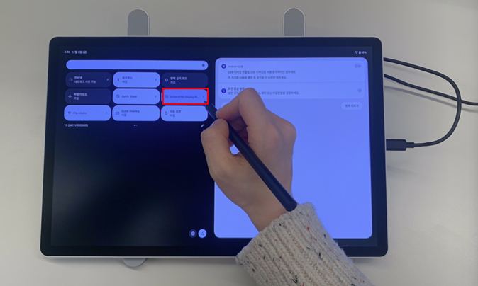 사전 세팅이 완료됐다면 이제 무빙크패드와 PC를 연결할 차례입니다. 가장 먼저 태블릿에서 빠른 설정 패널을 열어 ‘Instant Pen Display Mode’를 실행하고, PC에서도 같은 이름의 설치파일을 실행합니다.