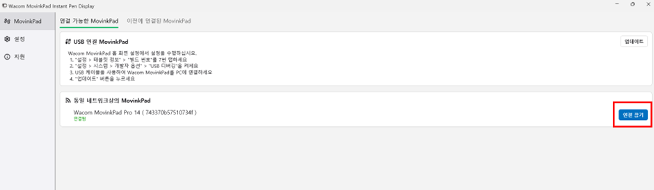 이후 PC 앱에서 USB로 인식된 무빙크패드를 선택해 연결 버튼을 눌러주면 바로 기능이 실행됩니다.