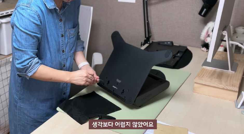 신티크 프로 17 전용 스탠드는 고가의 액정 타블렛을 안전하게 거치할 수 있도록 무게감이 있었습니다. 조립할 부품이 많아 혼자서 조립이 어려울까 걱정했는데요. 가이드를 보며 하나씩 조립하니 생각보다 어렵지는 않았습니다. 스탠드 높낮이의 높이는 다소 제한적이었지만, 고정해 주는 역할로는 아주 만족스러웠답니다. 사용 방법도 어렵지 않고 높이를 띄울 수 있다 보니 타블렛 아래에 키보드를 둘 여유 공간이 있어서 좋았어요. 사실 22인치가 넘어가는 큰 액정 타블렛은 여유 공간 유무에 따라서 키보드를 치는 팔과 어깨에 누적되는 피로도가 굉장히 달라지거든요.