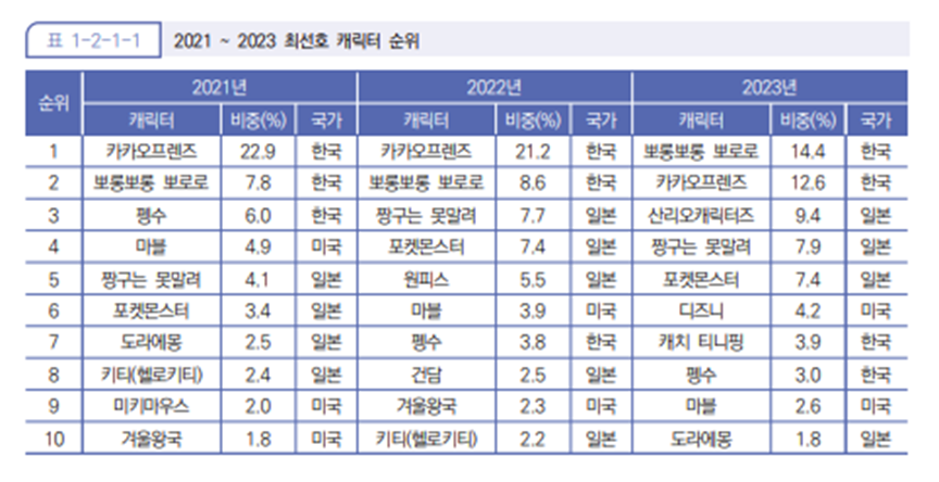 한국콘텐츠진흥원의 ‘2023 캐릭터산업백서’에 의하면 디지털 캐릭터 상품의 국내 이용 빈도는 주 1회 이상이 61.3%로 과반수 이상의 사람들이 일상에서 캐릭터를 사용하는 것으로 나타났는데요. 수많은 사람들의 사랑을 받고 있는 캐릭터는 국내 최고의 애니메이션 ‘뽀롱뽀롱 뽀로로’입니다. 최근 약진을 보여준 ‘잔망루피’도 포함돼 있죠.
