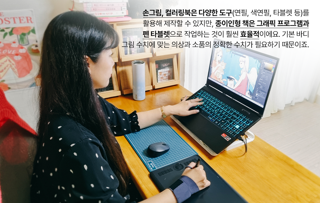 손그림이나 컬러링북의 경우는 아날로그 드로잉도 가능하지만, 종이인형 책의 경우는 타블렛과 그래픽 프로그램을 활용해 작업하는 것이 훨씬 용이해요. 수작업으로 인형과 옷을 만들었다고 해도 최종 배치는 역시 그래픽 프로그램을 쓸 수밖에 없어요.