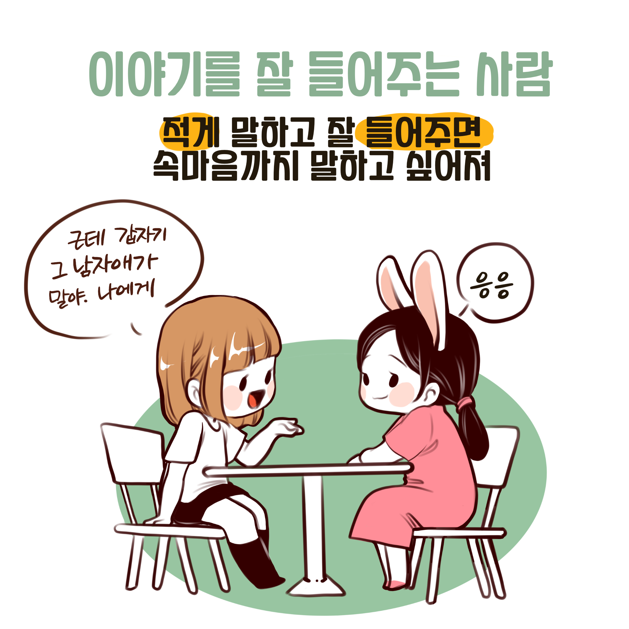 제작 과정은 일러스트 작업과 별반 다를 바 없지만, 과정이 훨씬 단축되고 간단해요. 내용에 맞춰 간단하게 그림들을 컷 방식으로 그려내면 되는데 그림도 심플하게 그려요. 채색도 간단하게 지정된 색 몇 가지만 사용하려고 노력하고요. 일러스트와 다른 점은 그림이 훨씬 단조롭고 간단하면서도 내용을 담을 글자가 포함된다는 거겠네요. 저의 인스타툰은 겉보기에 그림 위주처럼 보이지만 그림과 함께 글을 추가해서 만화에서 말하고자 하는 내용을 뒷받침해 좀 더 와닿게 설명해 주는 것이 특징입니다.