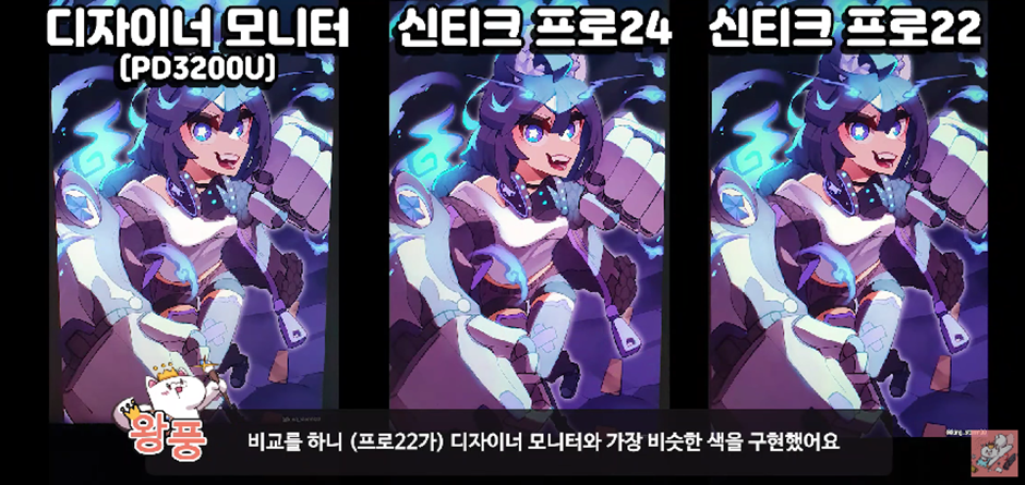 두 번째 장점은 DCI-P3 색역과 정밀한 필압감입니다. 와콤 신티크 프로 22는 DCI-P3 색역을 지원해 사용자가 원하는 색감으로 색 조정이 가능한데요. 제가 자주 사용하는 색감으로 조정해 디자이너 모니터와 비교해보니 가장 비슷한 색을 구현했어요. 그리고 1200:1 명암비로 어둡게 표현돼야 하는 부분이 좀 더 어둡게 잘 표현됐습니다.