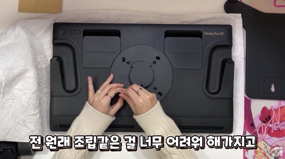 먼저 타블렛에 지지대와 연결할 원판을 조립해 주고 그 다음 지지대 기둥과 지지대 바닥 부분을 연결해 줍니다. 완성한 지지대를 똑바로 위치시킨 뒤 액정 타블렛과 함께 조립하면 되는데요. 이렇게 조립을 완성하고 타블렛 뒷면에 있는 커버를 열어 전원 선과 케이블 선을 연결해 주고, 펜 보관함까지 연결해주면 타블렛 설치 완료입니다.