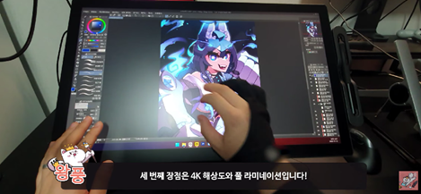 세 번째 장점은 4K 해상도와 풀라미네이션입니다. 높은 해상도로 고화질의 이미지를 구현해 내 그림을 볼 때 더욱 선명하게 확인할 수 있습니다. 또한 풀라미네이션처리로 펜과 화면 사이의 유격이 줄어들어 구형 제품보다 한층 업그레이드된 성능을 확인할 수 있었습니다. 추가적으로 발열도 거의 없었답니다.