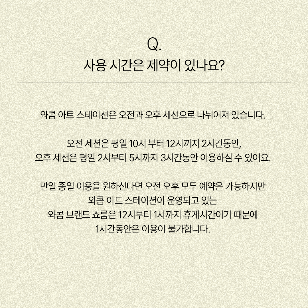와콤 아트 스테이션은 오전과 오후 세션으로 나뉘어져 있습니다. 오전 세션은 평일 10시부터 12시까지 2시간동안, 오후 세션은 평일 2시부터 5시까지 3시간동안 이용할수 있습니다. 만약 종일 이용을 원하신다면 오전과 오후 세션 모두 예약은 가능하지만 와콤 아트 스테이션이 운영되고 있는 와콤 브랜드 쇼룸은 12시부터 1시까지 휴게시간이기 때문에 1시간 동안은 이용이 불가합니다.