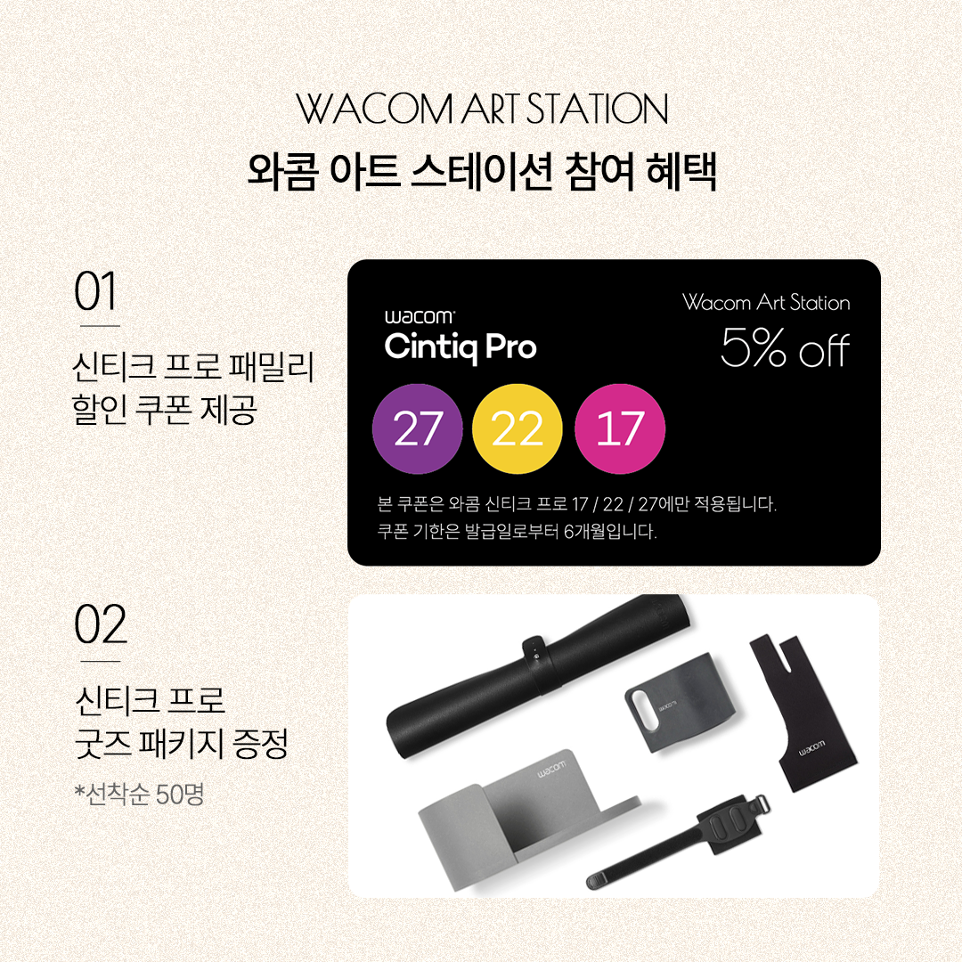 사전예약 신청자 대상으로 와콤 신티크 프로 굿즈 패키지가 선착순 50명에게 증정되며, 신청자 전원에게는 와콤 공식 온라인스토어에서 ‘신티크 프로’ 구매 시 사용 가능한 특별 할인 쿠폰(5%)도 제공될 예정이니 많은 참여 부탁드려요.