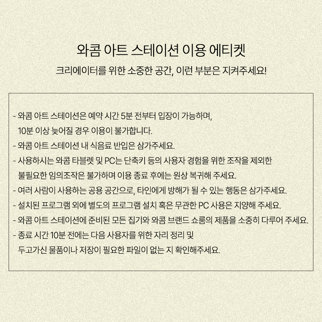 와콤 아트 스테이션은 오전과 오후 세션으로 나뉘어져 있습니다. 오전 세션은 평일 10시부터 12시까지 2시간동안, 오후 세션은 평일 2시부터 5시까지 3시간동안 이용할수 있습니다. 만약 종일 이용을 원하신다면 오전과 오후 세션 모두 예약은 가능하지만 와콤 아트 스테이션이 운영되고 있는 와콤 브랜드 쇼룸은 12시부터 1시까지 휴게시간이기 때문에 1시간 동안은 이용이 불가합니다.