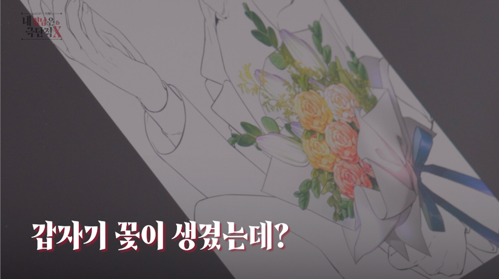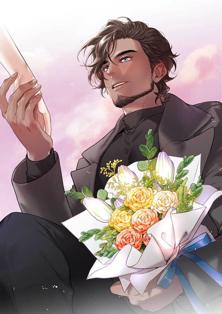 영화 속의 한 장면이라고 생각하고, 한 화면에 반영하는 게 작가로서의 업무인 만큼 이번 캐릭터는 약간 고백을 하는 듯한 느낌으로 캐릭터가 누군가에게 무릎을 꿇고 앉아있고 꽃다발을 들고 있는 모습, 그리고 살짝 얼굴을 붉혀서 진심 어린 모습을 표현하는 구도로 잡았습니다.