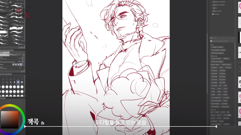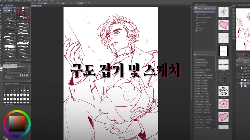 마감 기한이 있는 웹툰 작업을 하다 보면 이러한 소품들은 일일이 그릴 시간이 없는 편이에요. 그래서 드로잉 프로그램인 클립스튜디오 자체에 있는 소스를 불러와서 사용하고 있습니다. 다음으로 밑색과 채색 과정을 진행해 볼게요.