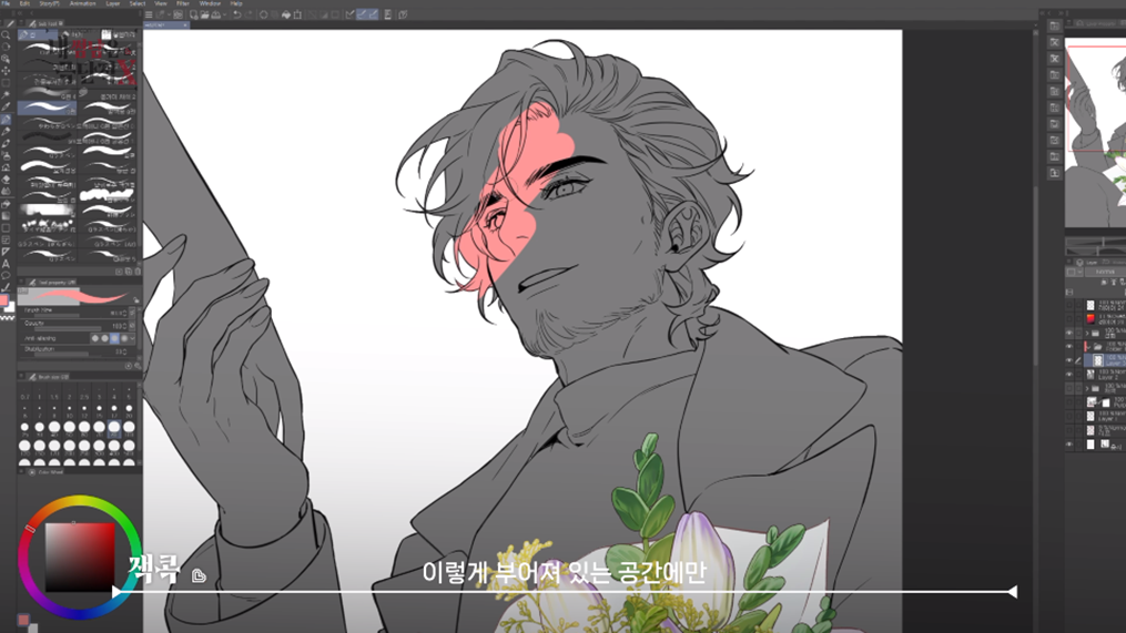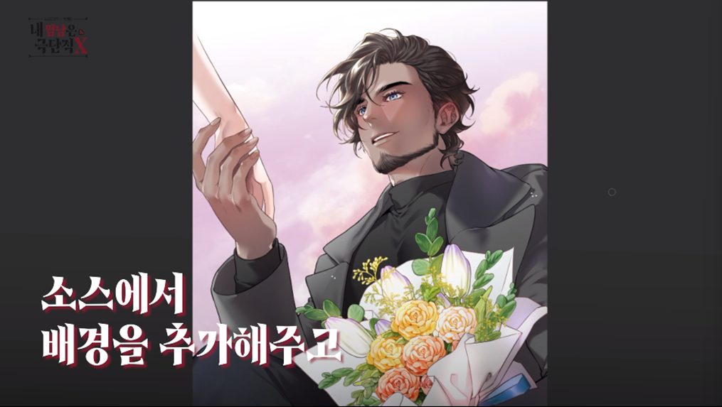 소스에서 배경을 추가해 준 뒤 마지막엔 작품의 전체적인 컬러감을 맞춰야 하기 때문에 ‘오버레이 레이어’ 기능을 사용해 전반적인 컬러감을 맞추고 보정까지 하면 ‘N형’ 미남 완성입니다. 캐릭터가 얼마나 로맨틱하고, 상대방에게 얼마나 집중하고 있는지 등을 모두 전달하는 것에 집중해 작품을 그려보았는데요. 세상엔 많은 형태의 미남이 있는 만큼 저의 ‘N형’ 캐릭터도 많이 사랑해 주셨으면 좋겠습니다!