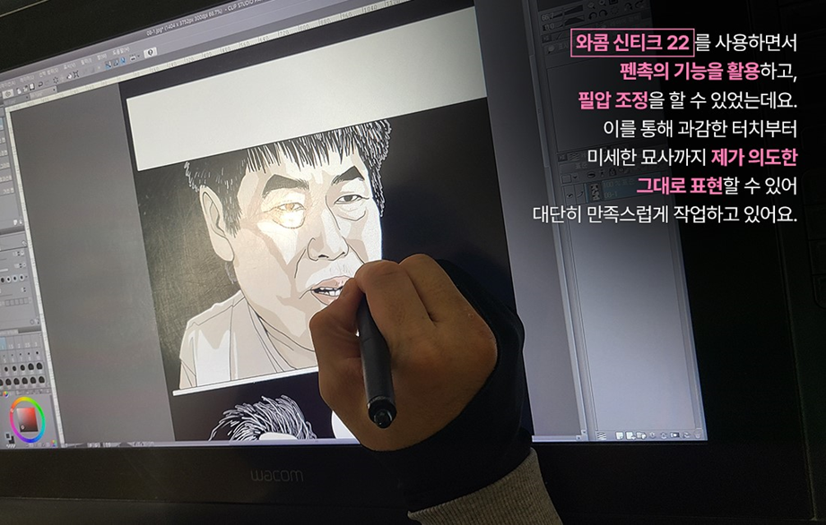 저는 채색, 이펙트 등의 효과보다는 오로지 ‘선’에 집중했습니다. 효율을 높이기 위해 데뷔작을 끝내고 와콤 신티크 22로 기변을 했죠. 요즘 야구만화를 작업하고 있는데, 스포츠 장르는 역동성의 표현이 중요하지 않겠습니까? 와콤 신티크의 펜촉 종류에 따른 기능들, 필압의 조정으로 과감한 터치부터 미세한 묘사까지 의도한 그대로 표현할 수 있어서 대단히 만족하고 있습니다.