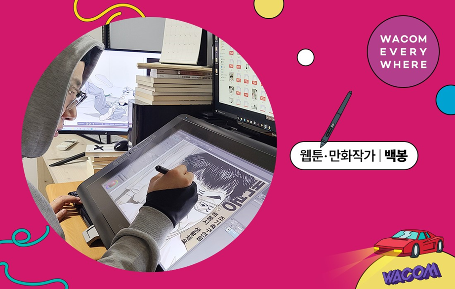 코미디 장르 좋아하는 분들 중에 영화 <족구왕>을 최애 작품으로 꼽는 분들 참 많을 텐데요. 영화 매니아 사이에서 지금껏 회자되는 <족구왕> 작품이 개봉하던 당시, 영화 홍보를 위해 제작한 웹툰 역시 매니아들 사이에서 회자가 됐습니다. 족구왕 웹툰이 영화의 사차원 개그를 충실히 묘사하면서도 진중한 메시지를 공유한다는 점에서 많은 팬들의 공감을 얻었었죠. ‘Wacom Everywhere’의 스물 네번째 주인공 백봉 작가는 <족구왕>의 홍보 웹툰에 이어 영화 <스물>에서도 본인의 웹툰 작품을 노출시키며, 대중들에게 ‘백봉 스타일의 웹툰’이라는 하나의 장르를 각인 시켰습니다. 또한, <노점묵시록>, <백봉평전> 등의 웹툰을 선보이며 코미디를 연출하는 뛰어난 감각과 격조 높은 풍자를 담은 ‘패러디의 귀재’로 많은 매니아 층을 보유하고 있는데요. 코미디를 즐길 줄 아는 와콤 유저부터 백봉 작가를 사랑하는 팬 모두 오늘 작가의 인터뷰를 주목해 주세요. 와콤과의 히스토리부터 작품 이야기, 작가로서 속시원하고 허심탄회한 이야기 모두 인터뷰에 담았습니다.