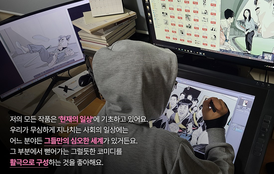 그곳에서 연출, 구성, 설정, 대사의 축약 등 심지어 의자에 앉는 방법, 펜 쥐는 법까지 처음부터 제대로 배웠습니다. 그렇게 3년을 배운 후, 독립해서 운 좋게 바로 웹툰 ’산송장’으로 데뷔했습니다. 되돌아보니 다른 길은 전혀 고려하지 않았던 것 같네요. 제가 그리는 만화는 스케일이 거창하더라도 결국은 소시민의 이야기입니다. 그래서 인물 작화도 길에서 흔히 볼 수 있는 반극화체의 캐릭터들이죠. 이런 주제를 이야기하다 보니 지금의 그림체가 만들어졌는지, 아니면 지금의 그림체로 그리다 보니 이런 주제들을 다루게 됐는지.. 그건 저도 잘 모르겠습니다. (하하)