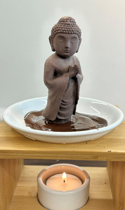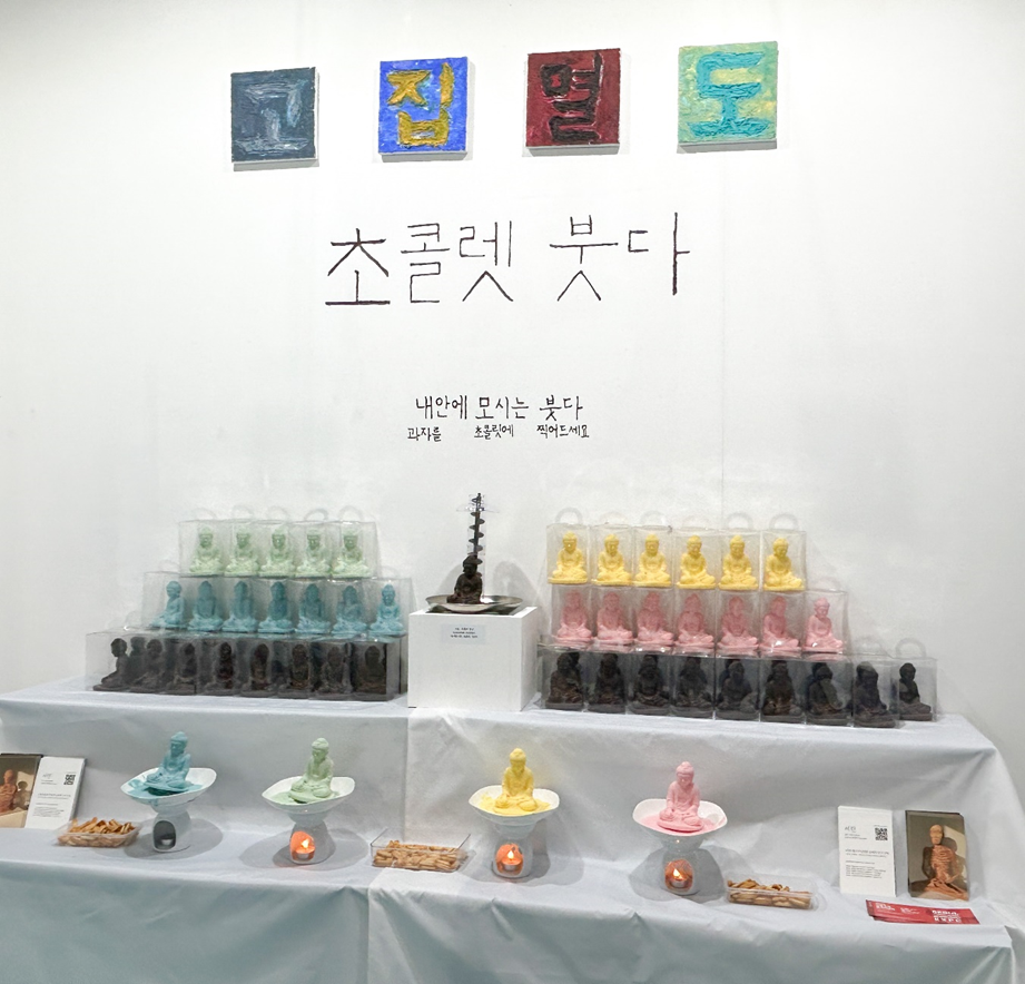 저는 평소 많은 미술작품이 일방적인 소통을 하고 있다는 생각을 자주 했어요. 소통이라 함은 오고 가야 하는 것인데 어떤 때에는 미술작품이 너무나 거만하고 불친절한 예술이 아닌가 싶더라고요. 이런 시각예술의 한계를 넘어설 수 있는 방법에 대해 고민하다가 시각뿐만 아니라 미각과 후각, 촉각까지 모두 자극할 수 있는 초콜릿이라는 재료를 굉장히 매력적으로 느끼게 되었어요. 그래서 언젠가 초콜릿을 활용해 작업을 하고 싶었는데, 불교 박람회를 준비하는 과정에서 자유롭게 모양이 변하는 초콜릿의 특징이 불교의 중심 철학을 표현하기에 좋은 재료가 된다는 생각이 들었어요. 그렇게 ‘초콜릿 붓다’를 처음 떠올리게 됐고 박람회장 안에서 운도 함께 따라주어서 화제가 될 수 있었던 것 같아요.