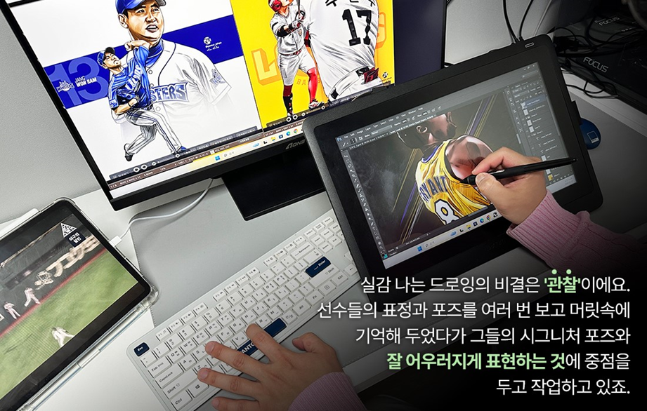 실감 나는 드로잉을 위해서는 ‘관찰’이 가장 중요하다고 생각합니다. 스포츠 스타들의 그림을 그리기 위해 이미지를 찾다 보면 선수들의 표정이 일그러져 있는 사진을 많이 볼 수 있는데요. 그것을 사실대로 그리게 되면 선수분들에게도, 그 선수의 팬분들에게도 좋은 반응을 이끌어내지 못할 거예요. 그렇기 때문에 경기 속에서 선수의 표정과 동작을 여러 번 보고 머릿속에 기억해 두었다가 원하는 이미지를 그릴 때 선수들의 일그러진 표정 등은 평상시 선수들의 얼굴에 가깝게 조금 변형을 주고 동작 또한 최대한 선수들의 시그니처 포즈가 잘 반영되어 나타날 수 있도록 표현하는 데에 중점을 두고 있습니다.
