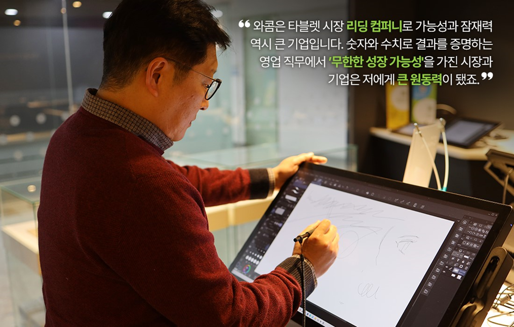 와콤에서 오랫동안 일한 만큼 제 청춘을 다 할애하며 업무를 했기 때문에 청춘이라고 할 수 있을 것 같고요. 와콤 타블렛은 타블렛 시장에서 선두를 잡고 지금까지 타블렛 시장의 흐름을 만들어왔고, 전문가용 드로잉 기기가 필요했던 웹툰 작가들에게 프로페셔널 타블렛을 제공해 왔던 점을 미루어 볼 때 ‘리딩 테크놀로지’라고 자신 있게 말할 수 있을 것 같습니다 .
