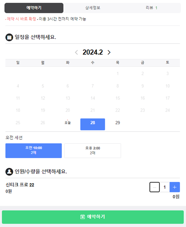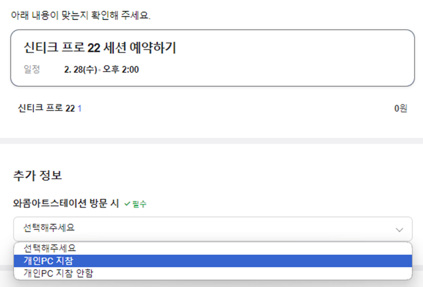 일정과 인원/수량을 모두 선택하신 후 하단의 초록색 예약하기 버튼을 누르면 마지막으로 예약 내용이 정확한지 확인하는 페이지로 넘어가게 됩니다. 해당 페이지에서는 개인 PC의 지참 여부 정보를 입력해야 합니다. 와콤 아트 스테이션 작업 공간에는 신티크 프로 제품과 함께 사용하실 수 있는 4K & 120Hz 지원 윈도우 및 맥 PC, 드로잉 SW 클립스튜디오 페인트 프로가 준비돼 있는데요. 혹시 개인 PC 사용이 편리하신 분들이라면 개인 PC 지참 시 신티크 프로에 연결해 사용하실 수 있도록 현장에서 지원을 해드리고 있습니다.