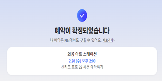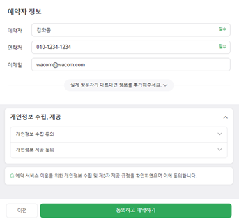 마지막으로 예약자 정보와 개인 정보 관련 규정을 모두 확인 후 하단의 ‘동의하고 예약하기’ 버튼을 클릭하면 와콤 아트 스테이션 예약 완료입니다. 여기까지 진행하셨다면 바로 네이버 어플을 통해 예약 확정 메시지를 받아 보실 수 있어요.